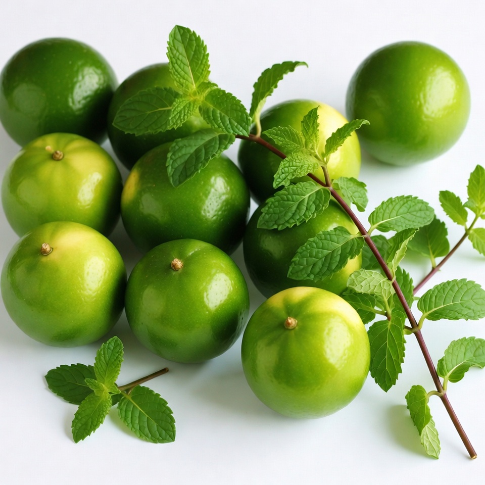 Several fresh green limes are arranged on a white background, surrounded by vibrant green mint leaves and stems. The limes have a glossy texture and are clustered together naturally. Mint sprigs add a fresh garnish around the citrus fruits.