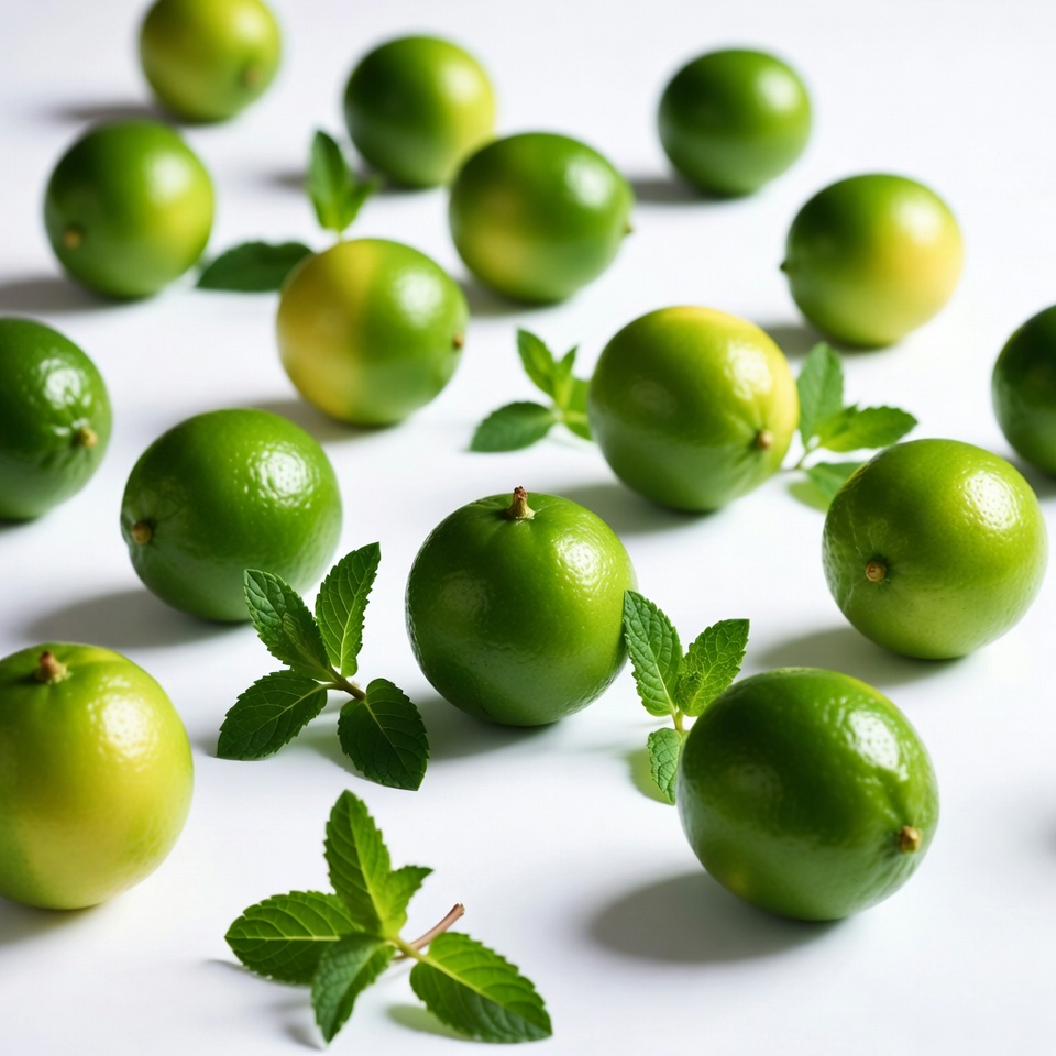 citrus fruit, food photography, fresh limes, fresh mint, fruit, green fruit, green limes, isolated, lime arrangement, lime fruit, mint garnish, mint leaves, white background, limes