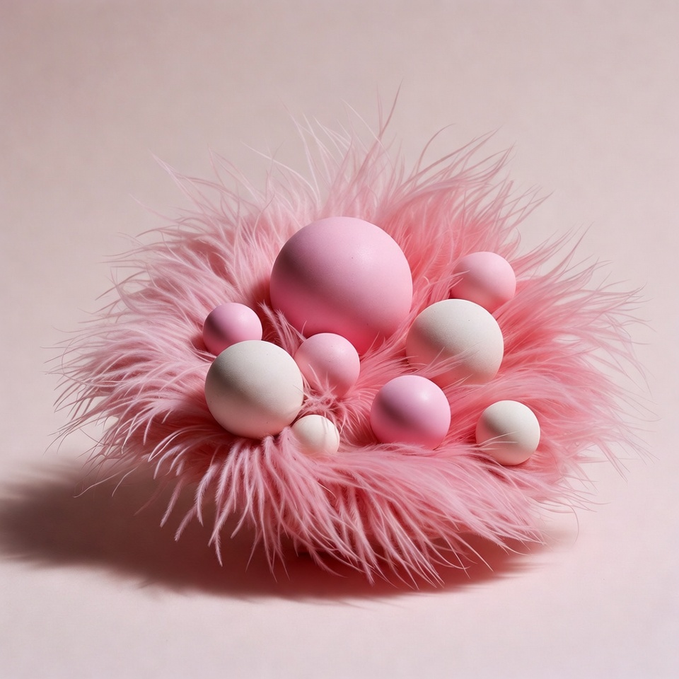 A large pink furry nest holds multiple smooth balls in shades of pink and white. The balls vary in size, nestled together within the fluffy pink fibers. The arrangement sits on a soft pink background.