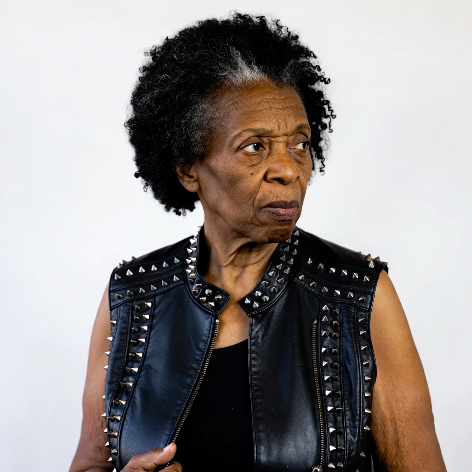 An elderly African-American woman with curly gray hair looks to the side against a white background. She wears a black leather vest adorned with silver studs over a black top. Her expression is serious with pursed lips.