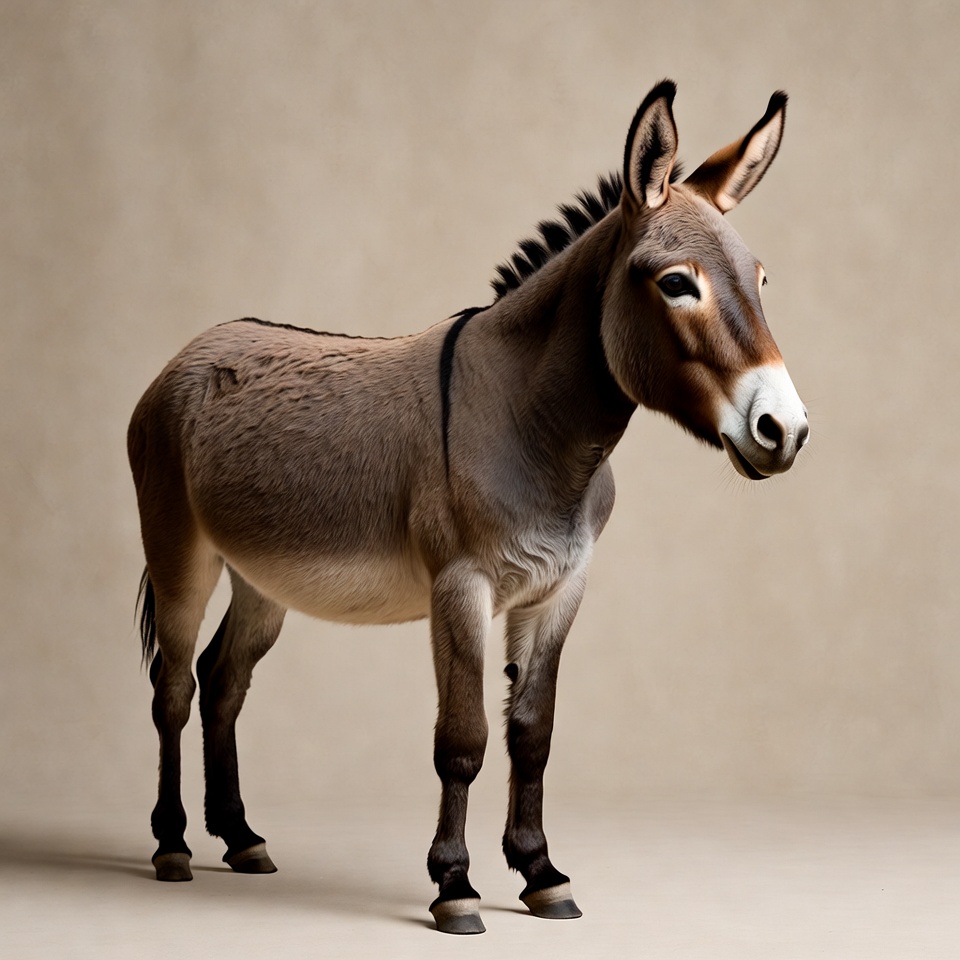 A brown donkey with large ears and a dark mane stands on a plain beige background. It has expressive eyes and a white muzzle, positioned in a side profile view. The donkey's legs are sturdy with hooves visible on the isolated background.