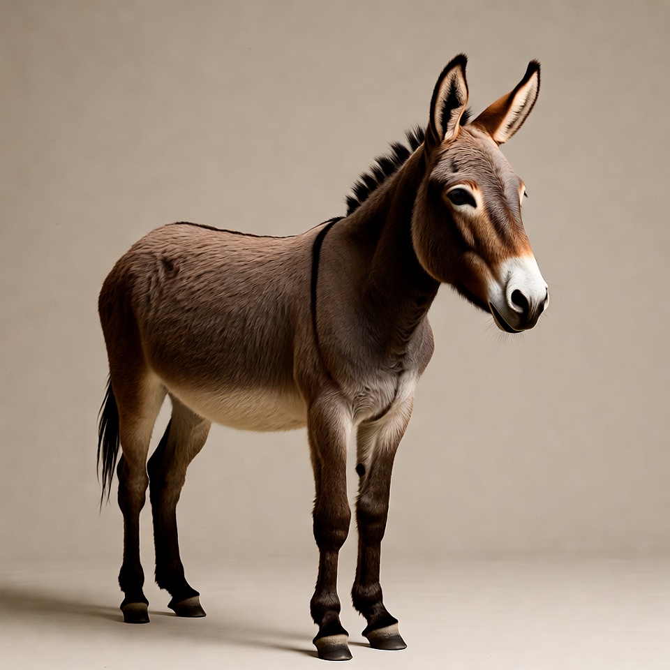 A brown donkey with long ears and a dark mane stands on a plain beige background. It has a white muzzle, expressive brown eyes, and a slightly curious expression. The donkey's coat is light brown with white underbelly and legs.