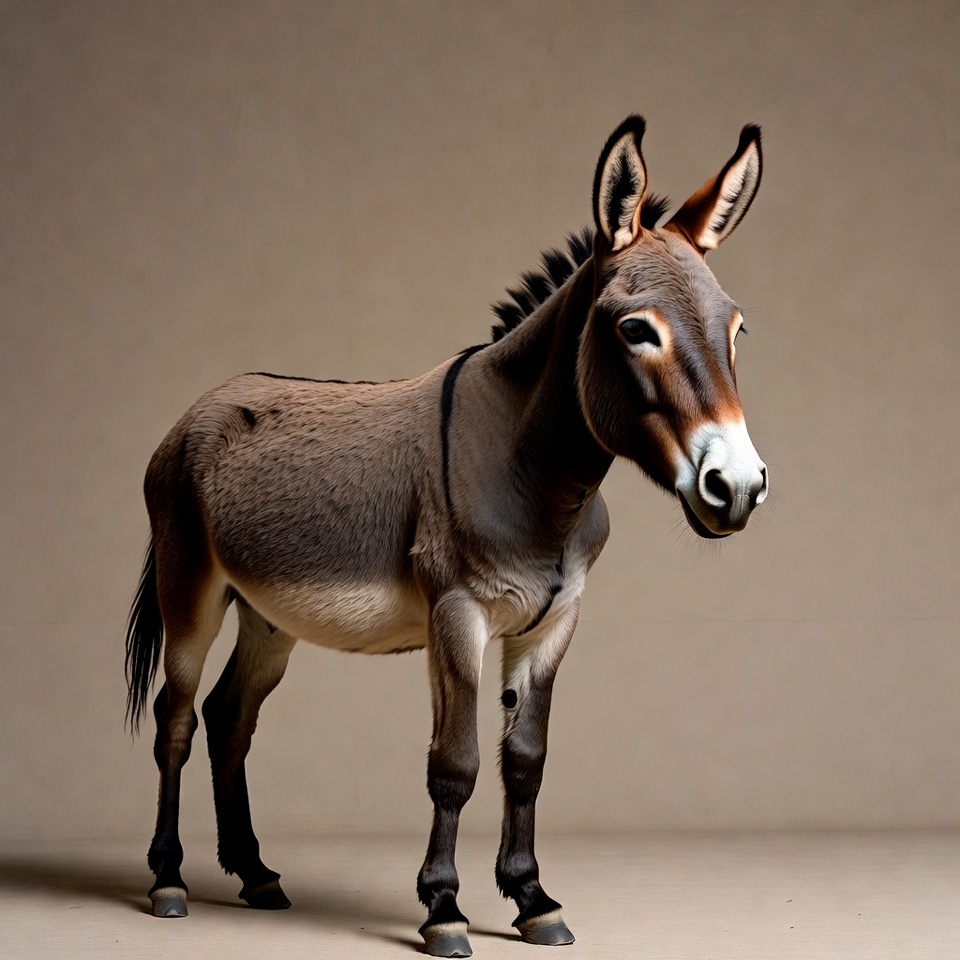 A brown donkey with large ears and expressive eyes stands on a plain beige background. Its mane is spiky, and it has a white muzzle with a slight smile. The donkey faces slightly to the side with its tail hanging down.