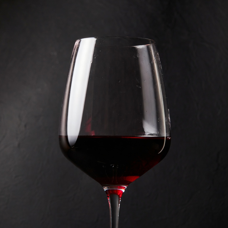 A tall wine glass filled with deep red wine stands against a dark black background. The glass features a clear crystal stem and bowl with subtle reflections highlighting the rich liquid inside. The deep crimson color of the wine contrasts sharply with the dark backdrop.