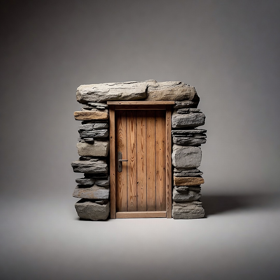 A rustic wooden door with a brass handle is framed by a stacked stone archway. The door and stones are centered against a plain gray background. The construction appears solid with irregularly shaped gray rocks.