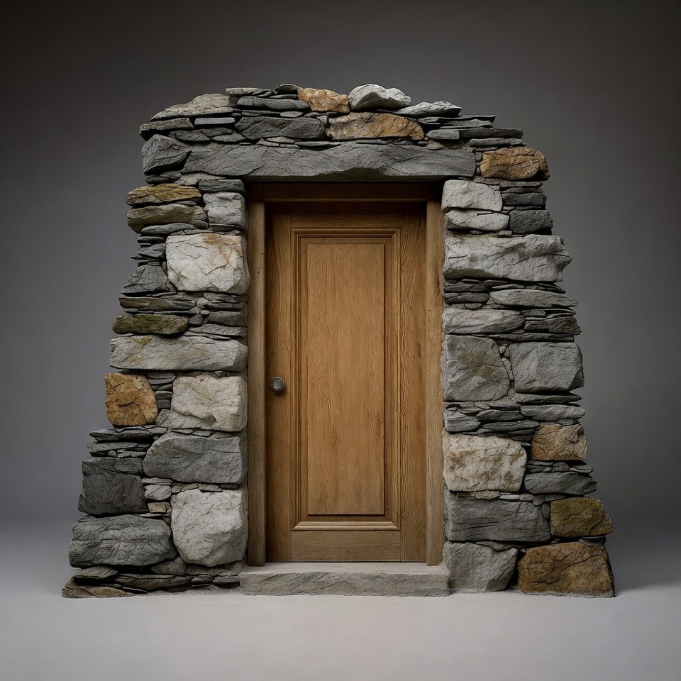 A rustic stone archway frames a wooden door with a brass doorknob. The structure is built from irregularly shaped gray and brown rocks stacked on both sides. It stands isolated against a plain gray background.