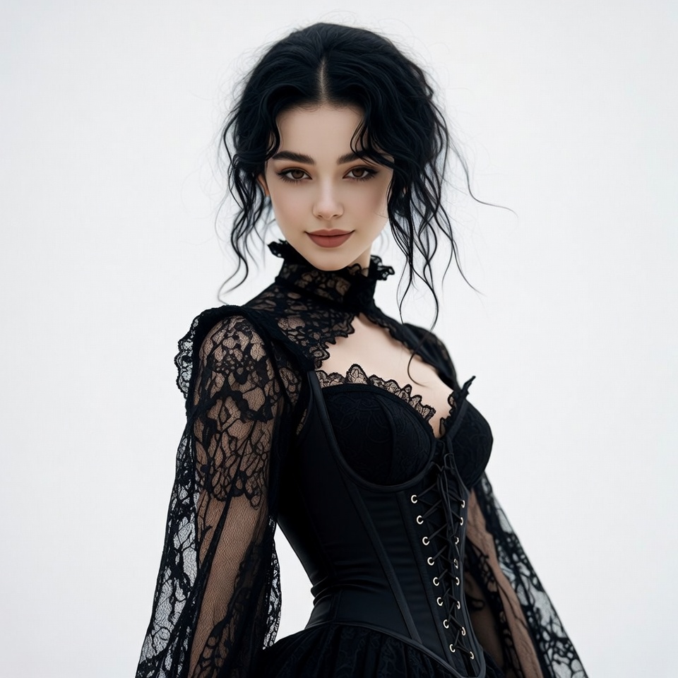 A young woman with long wavy black hair poses against a white background. She wears an elaborate black lace corset dress with puffed sleeves, ruffled collar, and lace-up detailing. Her expression is soft and alluring with subtle makeup.