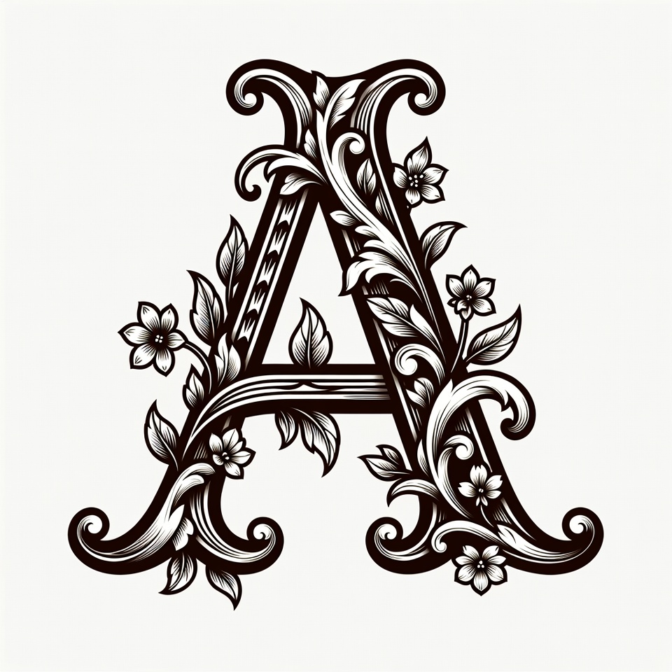 A intricately designed black letter A features elaborate floral and vine decorations. Delicate flowers and leaves wrap around the elegant typography. The illustration is rendered in a vintage engraving style on a white background.