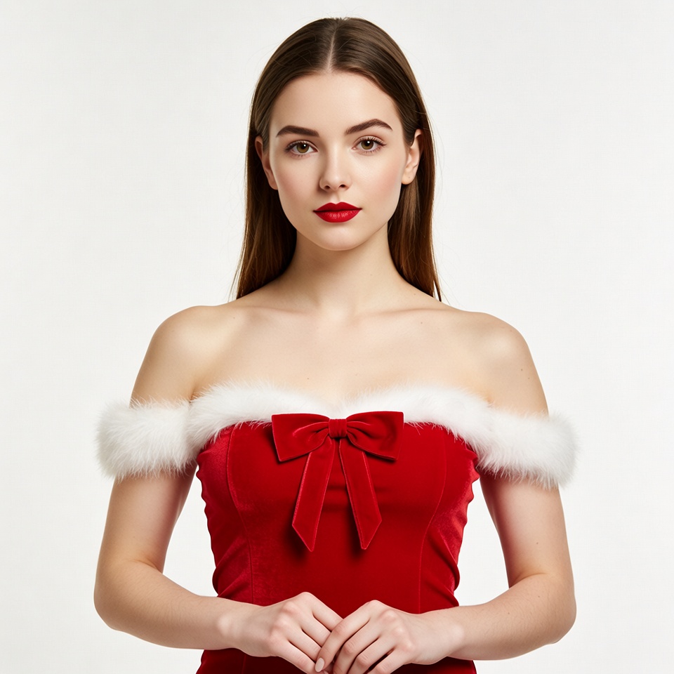 A young woman with long straight brown hair and red lips stands against a white background. She wears a strapless red velvet Santa dress with white fur trim on the shoulders and a large red bow at the front. Her hands are clasped together in front of her.