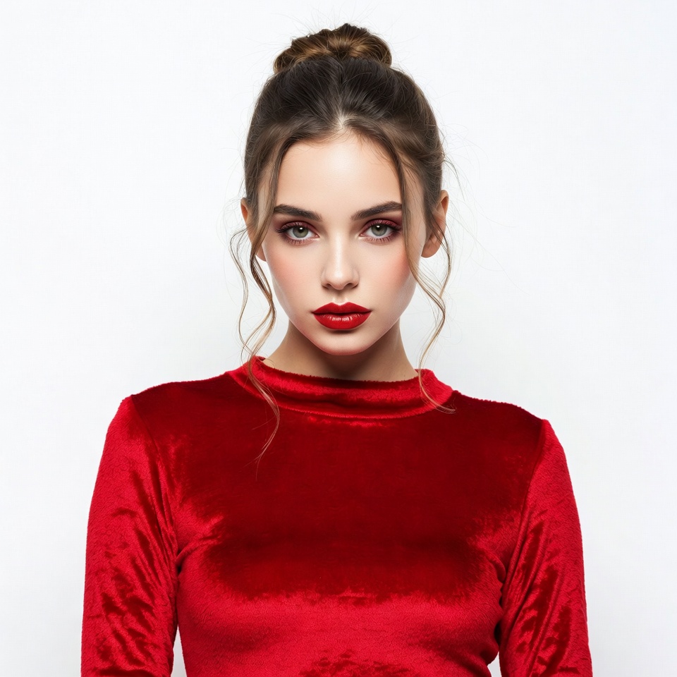 White, beauty, bun hairstyle, closeup face, dark hair, eyeliner, fashion, female, green eyes, isolated background, mock neck, portrait, red lipstick, red top, studio portrait, velvet top, wavy hair, young woman, woman
