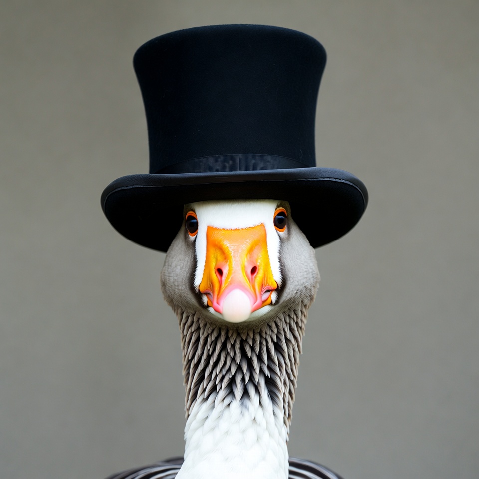 A greylag goose with white and gray feathers wears a black top hat on its head. The bird faces forward with its orange beak visible beneath the hat. It stands against a plain gray background.