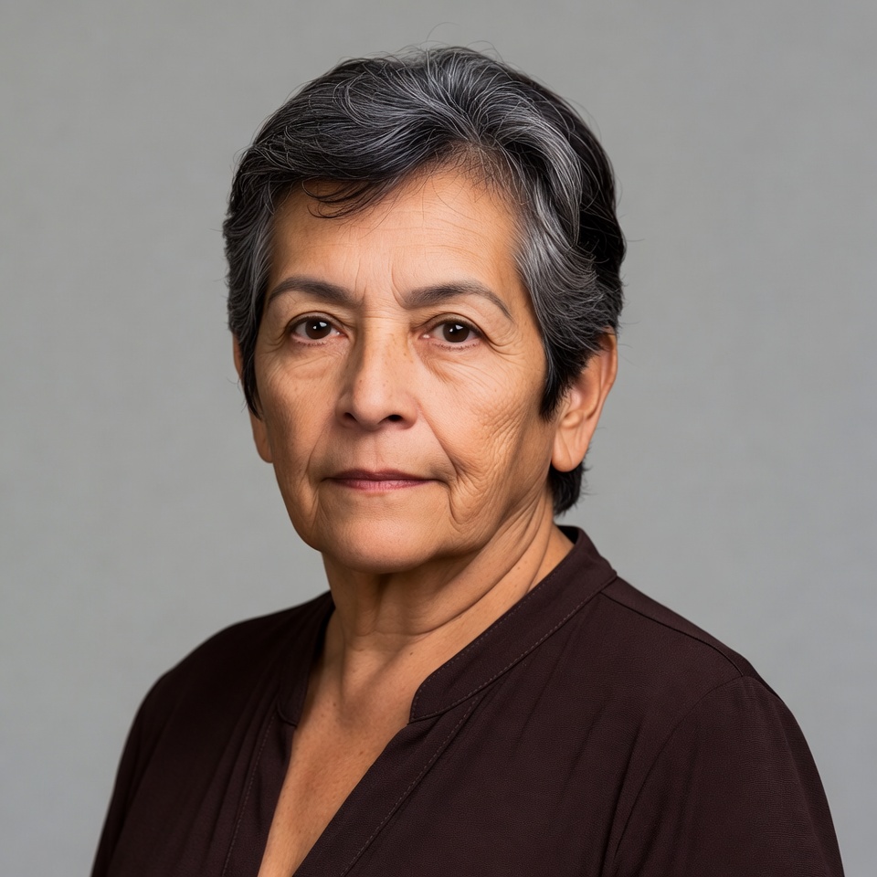 Latina, brown eyes, closeup, face, female, gray background, gray hair, headshot, maroon top, older woman, portrait, senior woman, short hair, v-neck, woman