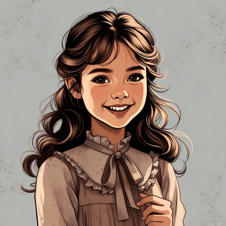 A digital illustration of a young girl with long wavy brown hair styled in a partial updo smiles warmly at the viewer. She wears a vintage-style beige dress with a collared neckline, ruffled edges, and a bow tie. Her large expressive eyes and soft features are set against a textured gray background.