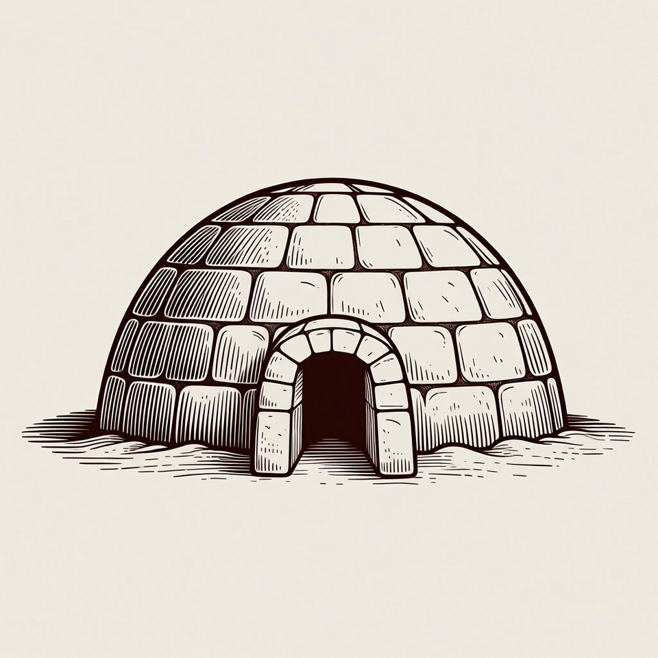 arched door, arctic shelter, beige background, clipart, dome structure, eskimo hut, hand drawn, ice dome, illustration, isolated background, line art, snow blocks, snow house, winter dwelling, igloo