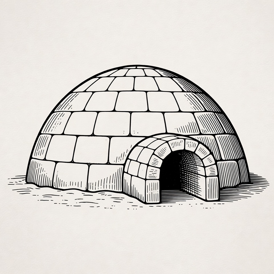 A detailed black line drawing of a traditional igloo made from snow blocks. The dome-shaped structure features a curved entrance tunnel on the side. It is rendered in an engraving style on a white background.