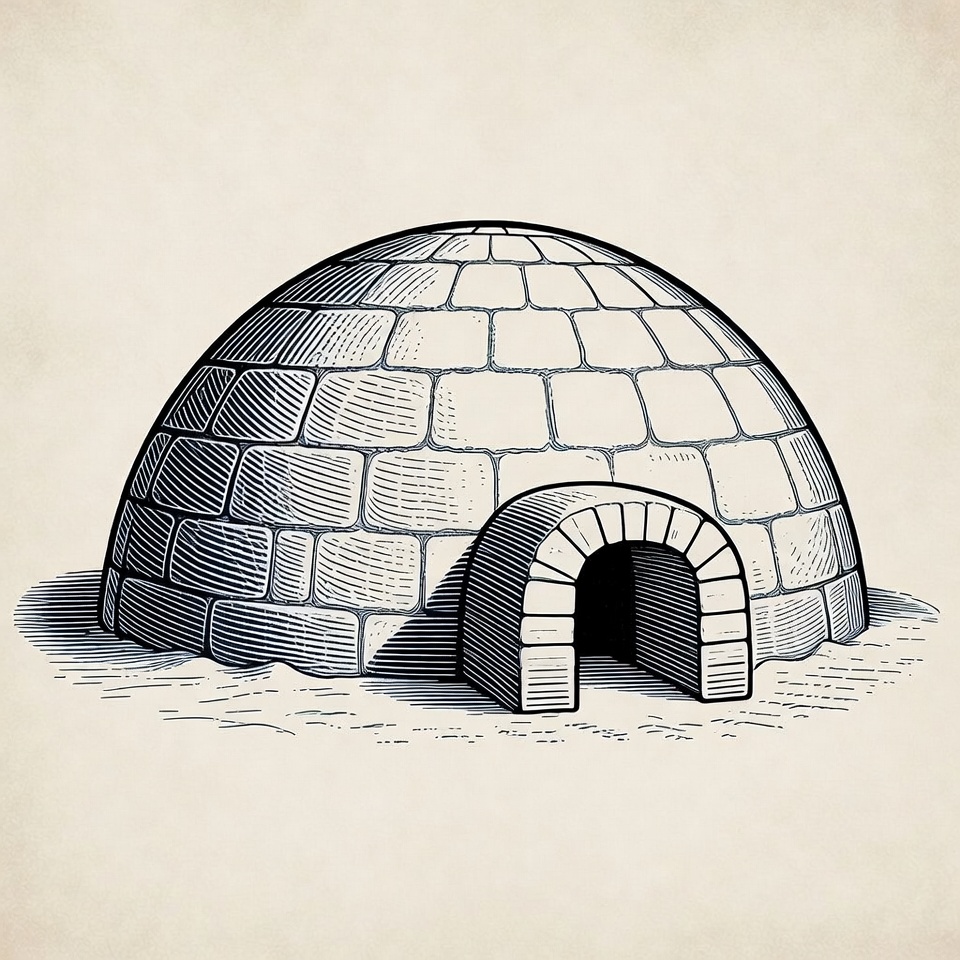 arched entrance, arctic shelter, clipart, dome structure, drawing, eskimo home, ice hut, illustration, ink art, isolated background, snow blocks, snow house, vintage style, winter dwelling, igloo