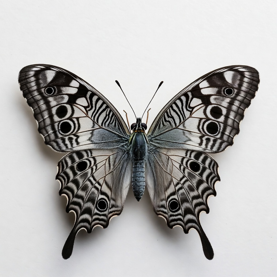 A striking White Peacock butterfly with intricate black and white wing patterns is displayed with wings fully spread. Prominent eyespots and wavy stripes adorn its wings against a plain white background. The butterfly's body is slender and grayish.