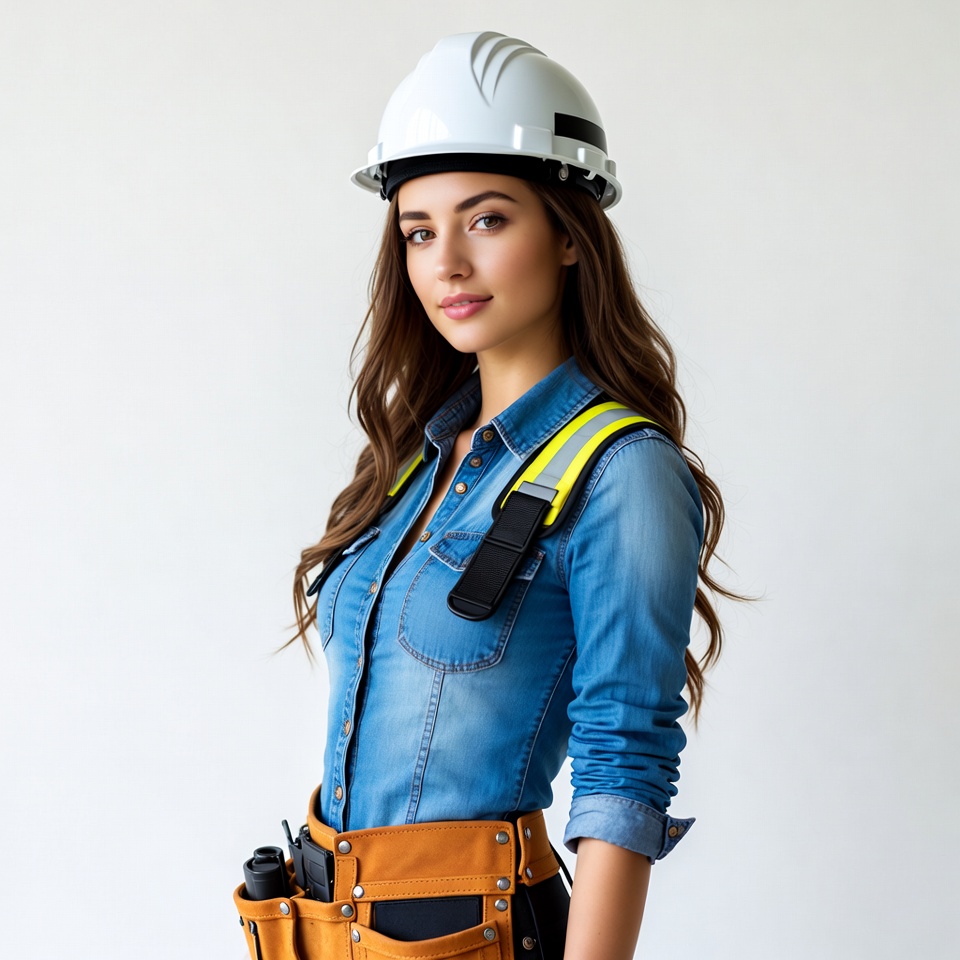 A young woman with long brown hair wears a white hard hat and stands confidently against a white background. She is dressed in a denim shirt with reflective straps and an orange tool belt holding tools. Her pose is professional, highlighting construction worker attire.