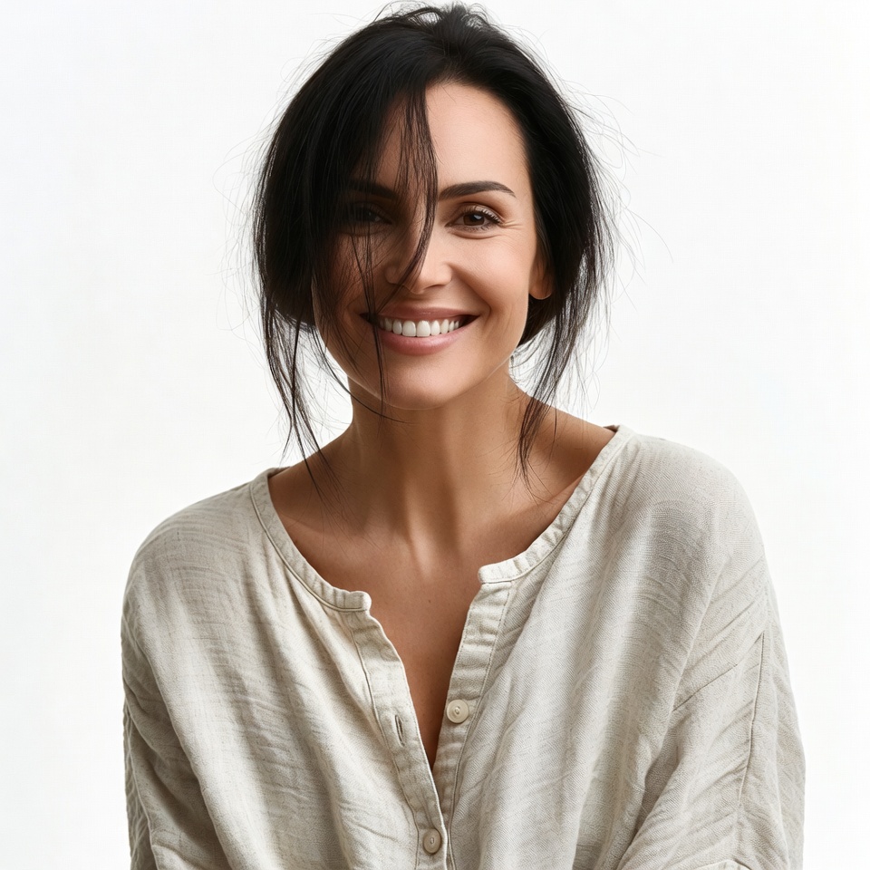 A woman with long dark hair smiles warmly at the camera against a white background. She wears a light beige linen shirt with a V-neck and buttons. Her hair is styled loosely with strands framing her face.