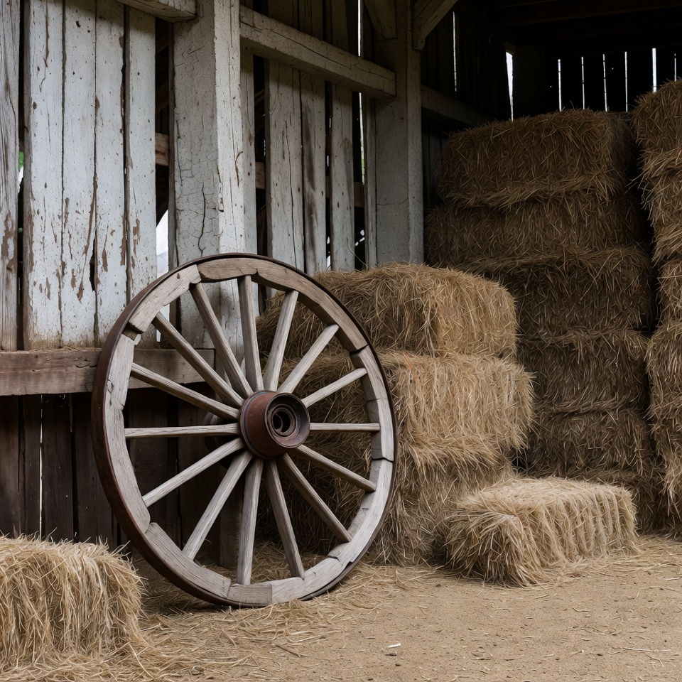 A large wooden wagon wheel with a rusted metal hub leans against stacked hay bales in a rustic barn. The weathered white wooden barn walls and open structure frame the scene. The dirt floor adds to the farm setting.