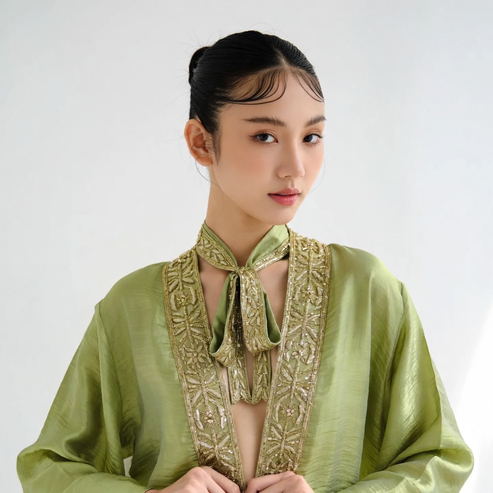 A young Asian woman with black hair styled in a bun gazes at the camera against a white background. She wears a luxurious green silk jacket with intricate gold embroidery and a matching green necktie bow. Her hands are positioned at the front of the open jacket.