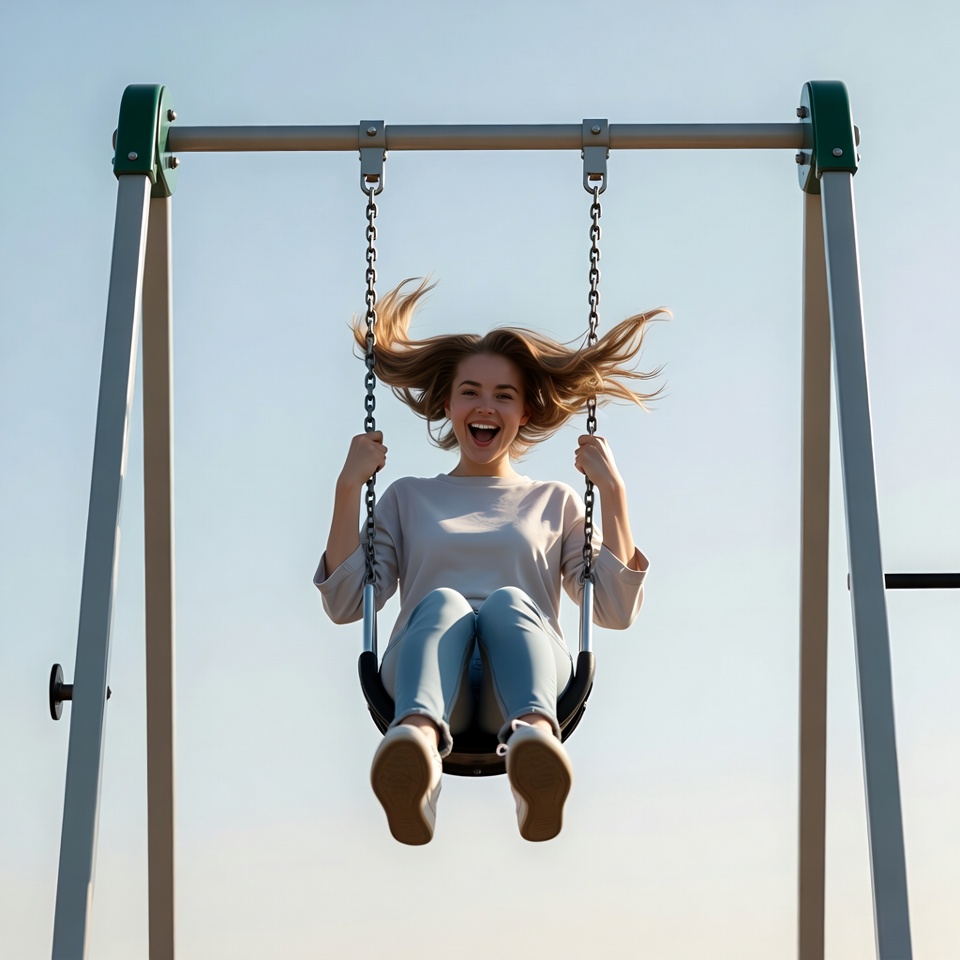 A young girl with long brown hair flying in the wind swings high on a metal playground swing set. She wears a gray sweatshirt, blue jeans, and white sneakers, smiling happily while gripping the chains. The background features a clear blue sky.