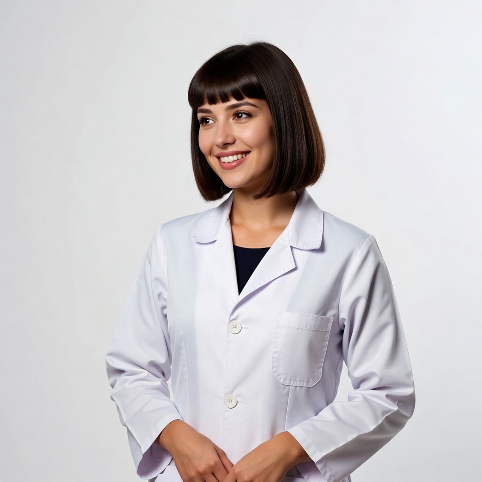 A young woman with straight brown hair and bangs smiles while looking to the side. She wears a white lab coat over a dark top and stands against a plain white background. Her hands are clasped in front of her.