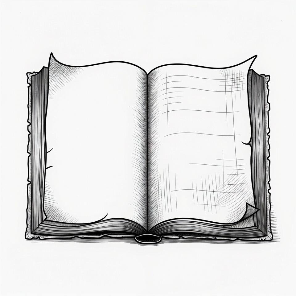 A detailed black line drawing illustrates an open book with blank pages. The pages feature subtle grid lines and curled edges, giving a vintage sketchbook appearance. The cover has textured, worn edges in ink sketch style.