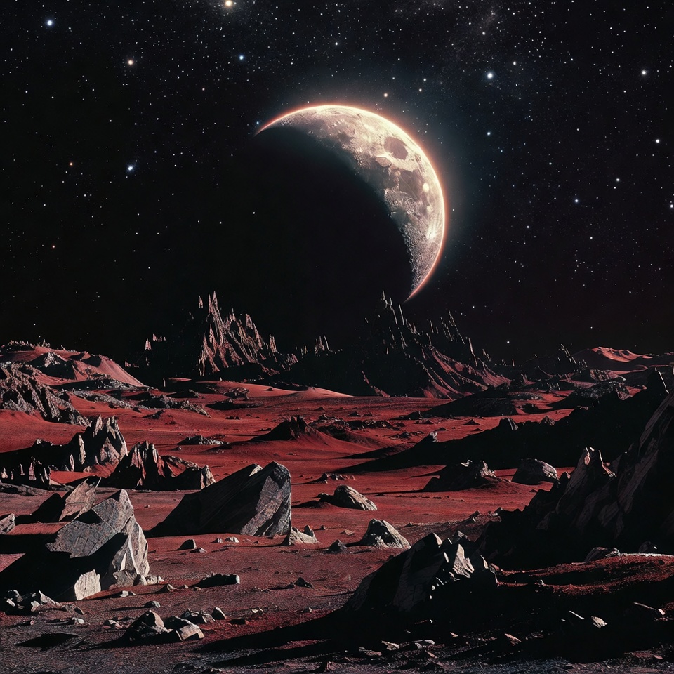 A large crescent moon glows in a starry black sky above a rugged red planetary surface. Jagged rock formations and boulders dot the dusty crimson terrain. The scene depicts an otherworldly extraterrestrial landscape with dramatic lighting.
