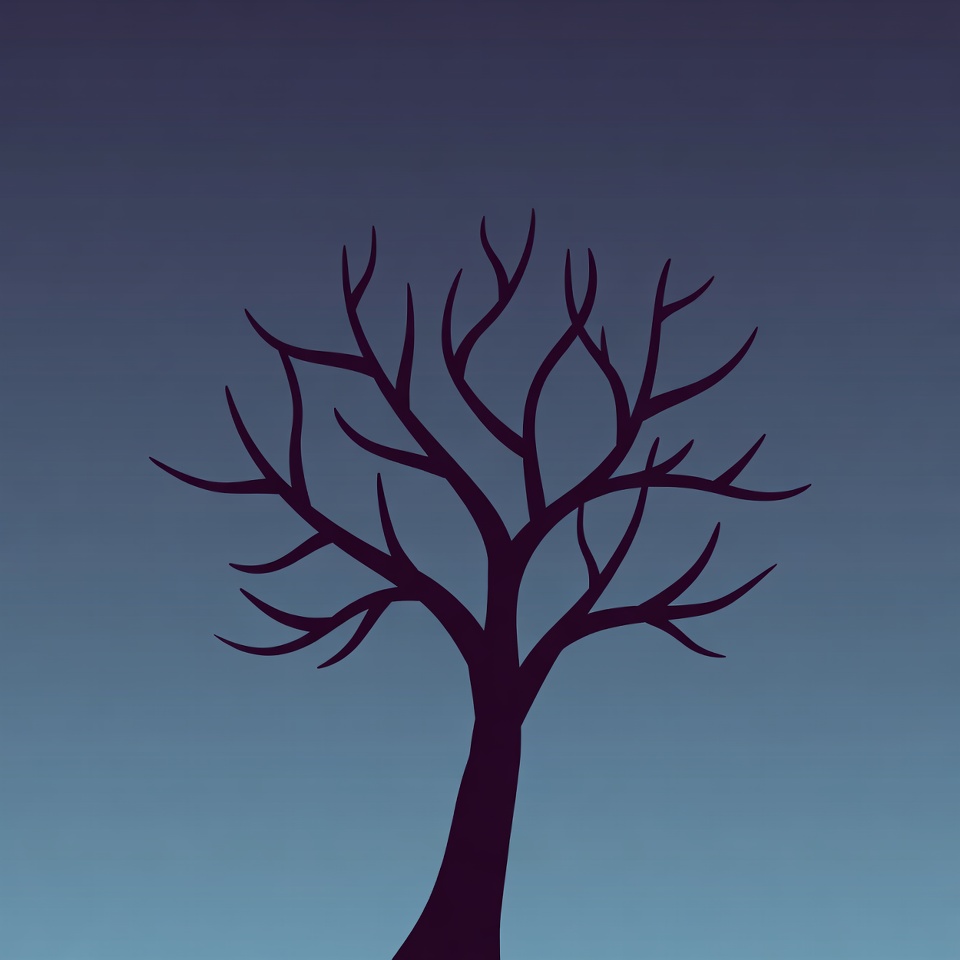 A minimalist silhouette of a barren tree with twisted, leafless branches stands against a deep blue gradient sky. The tree trunk is thick and dark, branching out intricately at the top. It appears as a simple vector illustration on an isolated background.