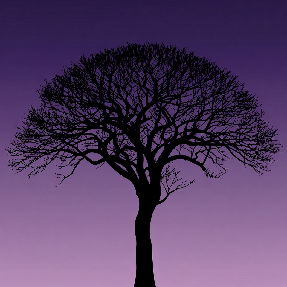 abstract tree, bare tree, barren branches, black silhouette, clipart, dark tree, gradient background, illustration, isolated background, leafless tree, nature graphic, purple background, shadow tree, tree trunk, winter tree, tree silhouette