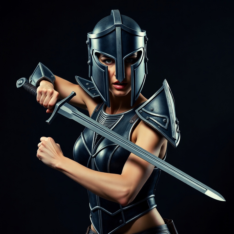 Female warrior in helmet holding sword