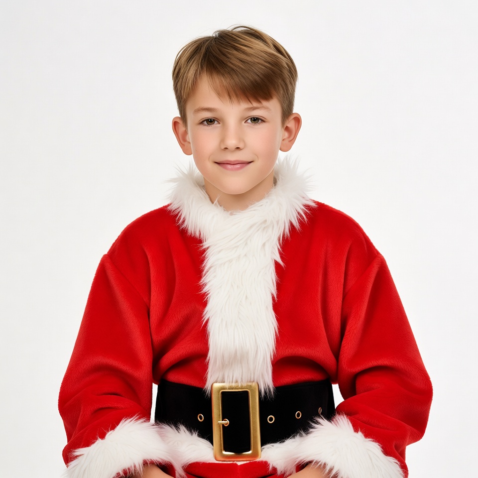 A young boy with light brown hair smiles at the camera while wearing a red Santa Claus suit with white fur trim. The costume features a wide black belt with a gold buckle and fluffy white edges on the sleeves and collar. He stands against a plain white background.