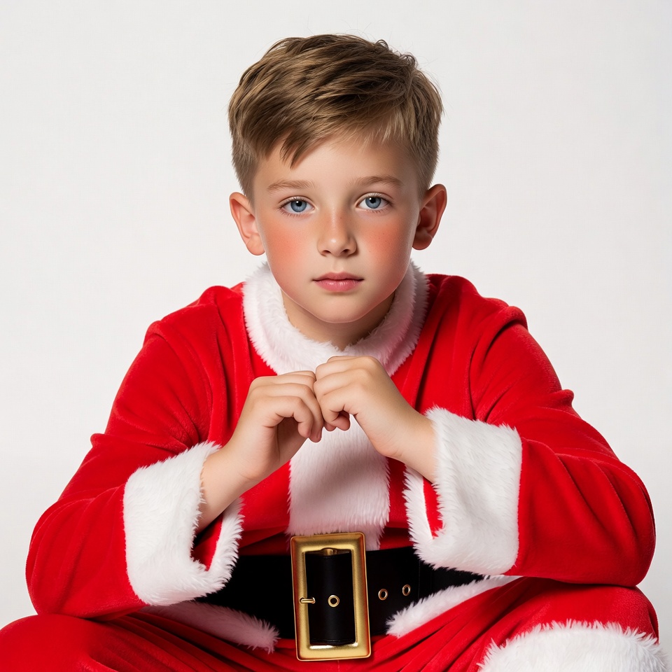 A young boy with short blonde hair wears a full red Santa Claus suit with white fur trim and a wide black belt. He sits with hands clasped together in front, smiling slightly against a plain white background. The costume includes fluffy white cuffs and pants.
