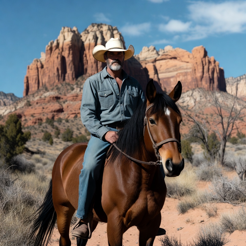 A man with a white cowboy hat and gray beard rides a brown horse in a desert landscape. He wears a blue denim shirt, jeans, and boots while holding the reins. Red rock formations rise dramatically against a clear blue sky in the background.