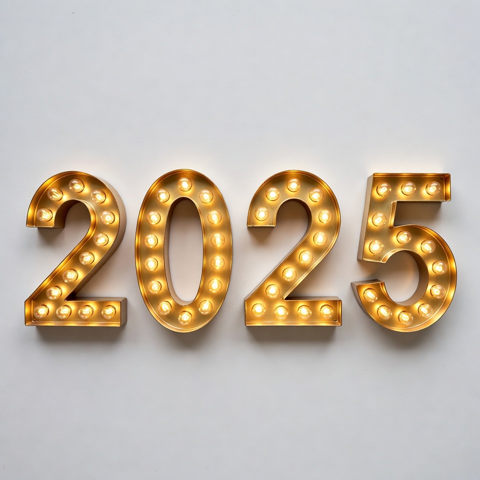 New Year, bold numbers, bright lights, celebration prop, countdown sign, elegant typography, festive decoration, glowing sign, gold font, golden letters, holiday graphic, illuminated bulbs, light bulbs, marquee style, numeric sign, retro style, shiny metal, white background, year 2025, 2025
