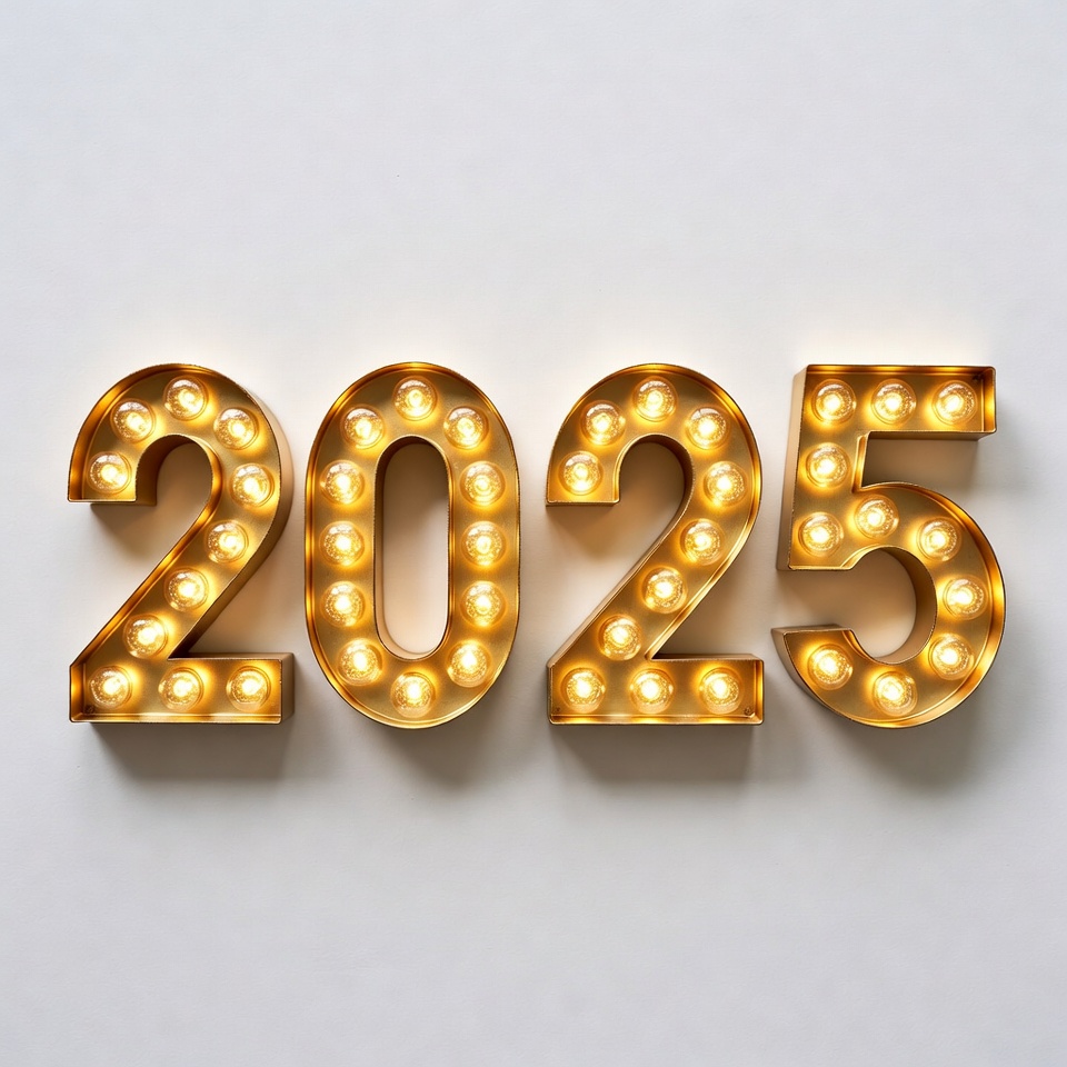 A large golden 2025 sign made of illuminated LED bulbs glows brightly against a plain white background. The numbers feature a retro marquee style with numerous small lights outlining each digit. The sign is centered and evenly lit for a festive appearance.