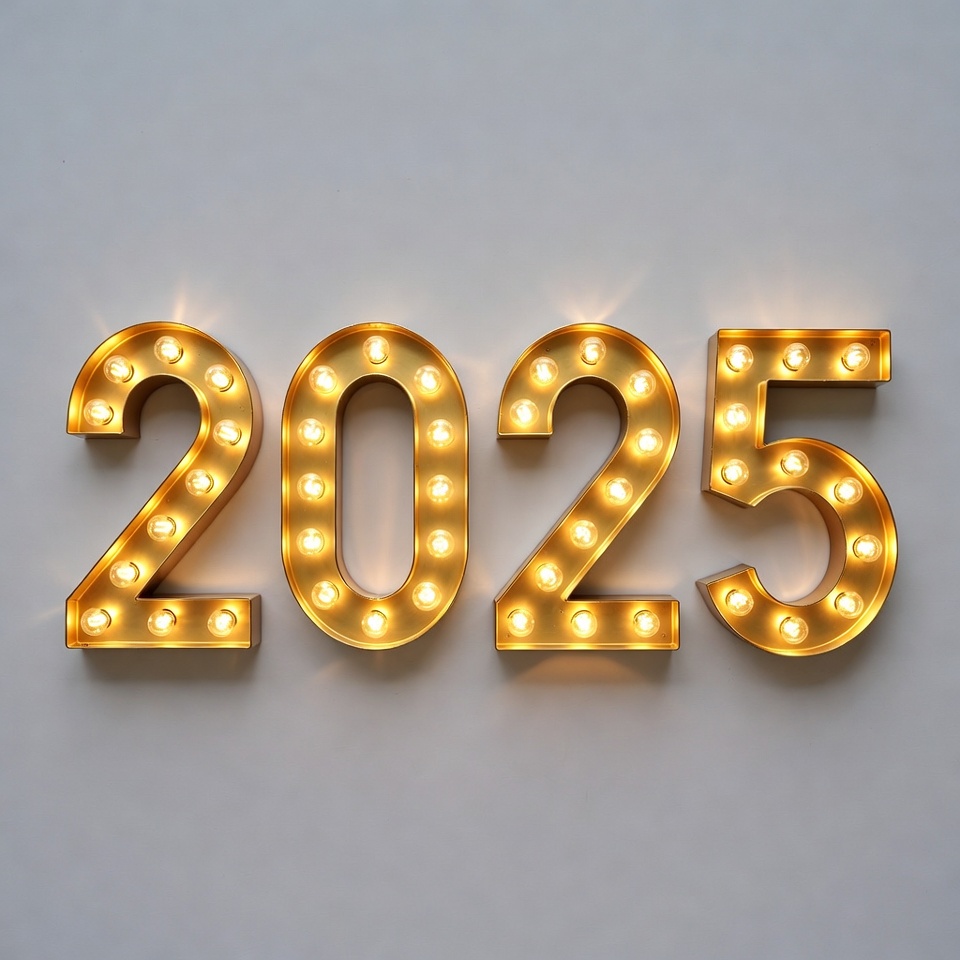 Large golden 2025 numerals made of illuminated marquee-style letters with bright bulbs glow against a plain gray background. The numbers are stacked in three rows with a subtle reflective shine. The design features a classic retro sign appearance.
