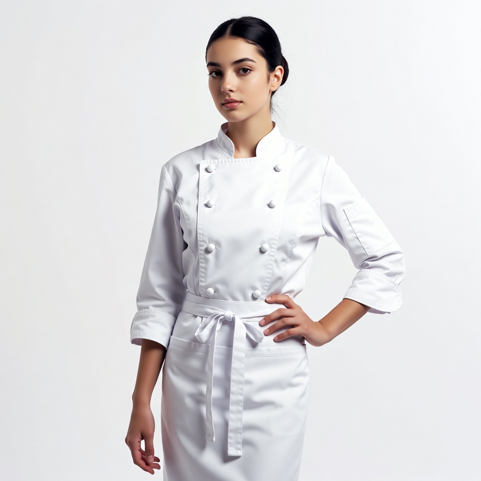 A young woman with dark hair in a bun stands confidently wearing a white double-breasted chef jacket and matching pants. She has one hand on her hip and the other relaxed at her side. The image features a plain white background.