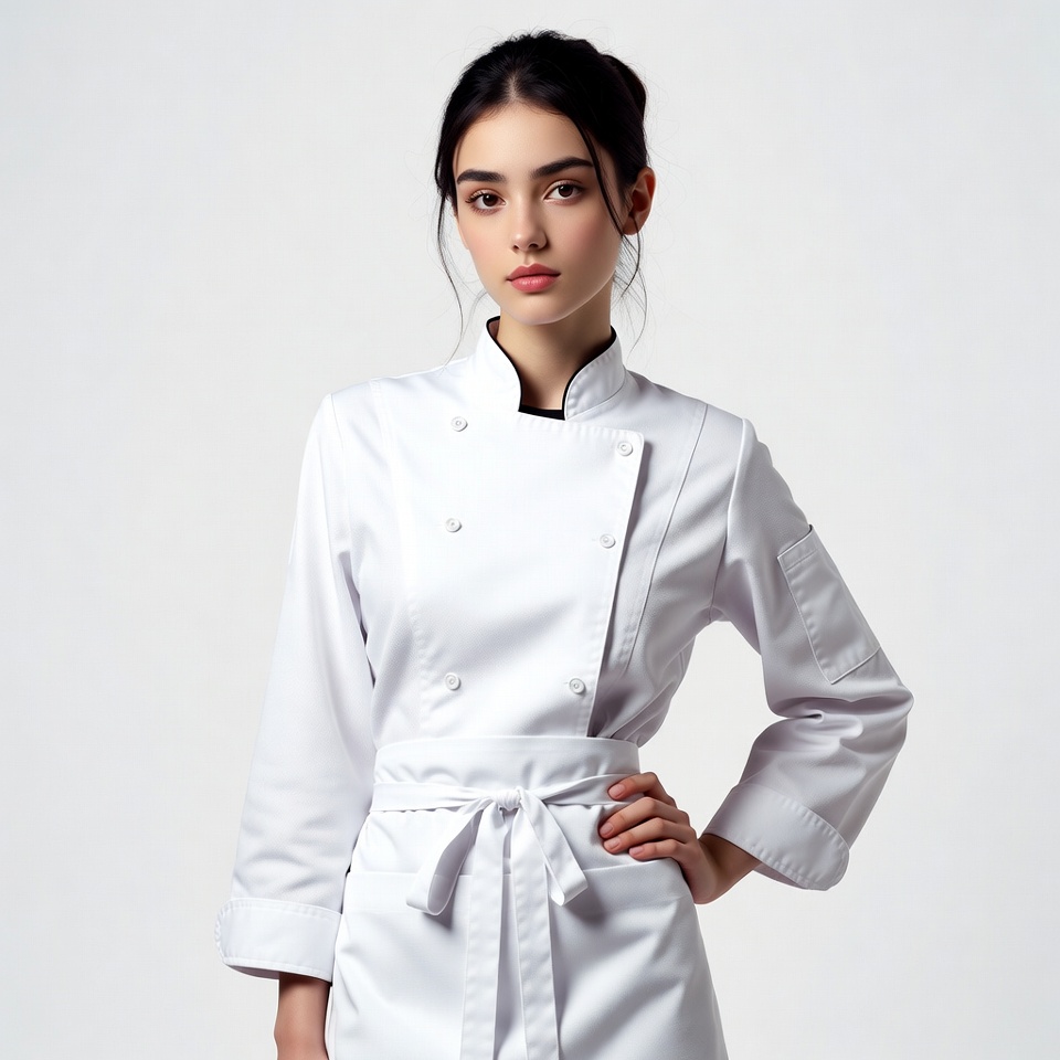 A young woman with dark hair in a bun wears a white double-breasted chef jacket with a waist tie. She stands confidently with hands on hips against a plain white background. Her expression is poised and professional.