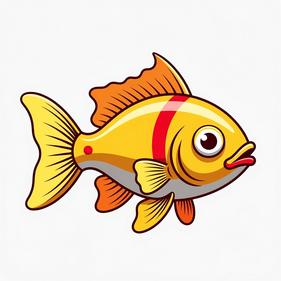 A vibrant cartoon goldfish features a shiny yellow body with a bold red stripe across its side. It has large expressive eyes, orange fins, and a small open mouth. The illustration is set against a plain white background.