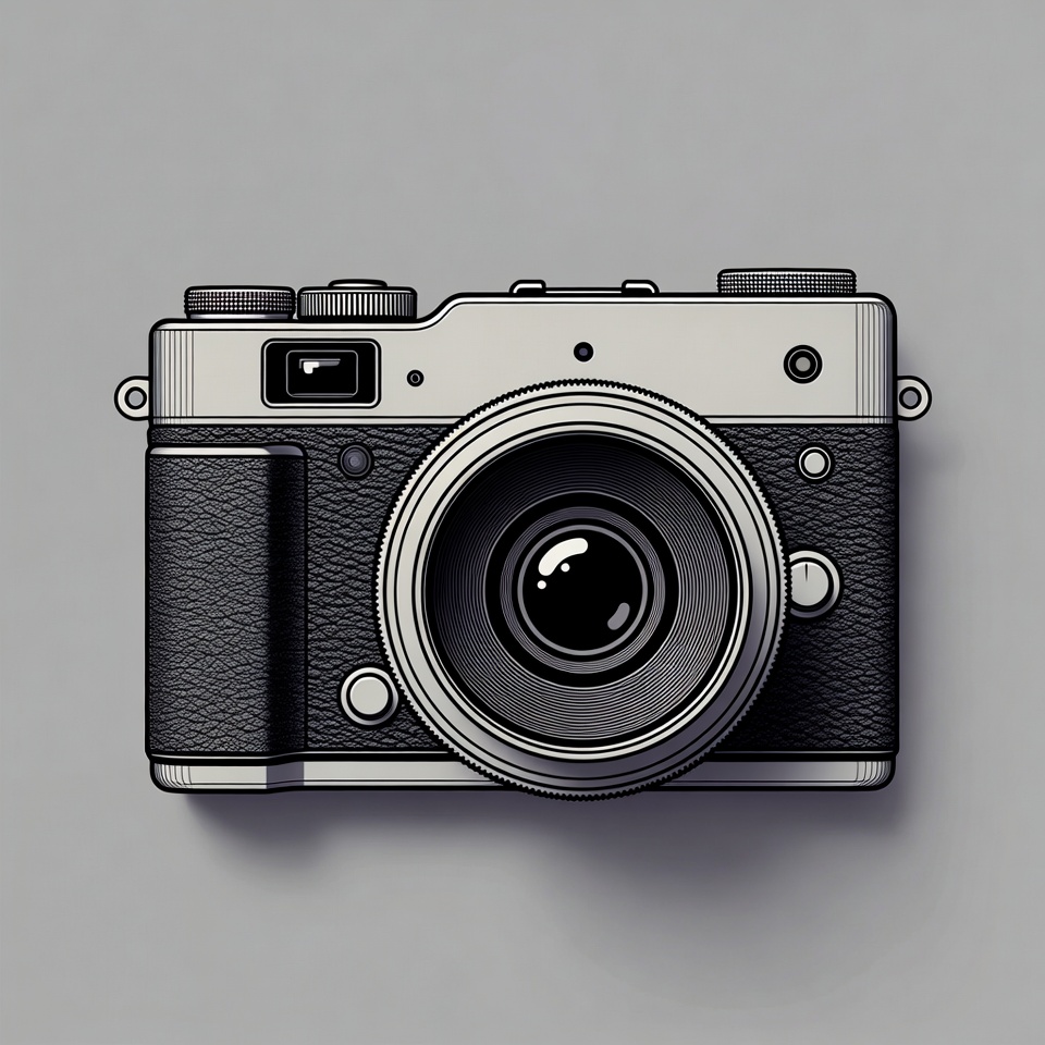 A detailed line art illustration of a vintage-style rangefinder camera with a prominent lens and leather grip. The camera features metallic body accents, manual dials, and a viewfinder on a plain gray background. It is depicted in a flat, isolated view from the front.