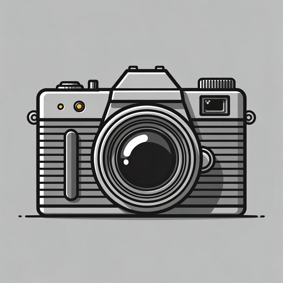 A detailed line art illustration of a vintage gray camera with a large lens. It features textured stripes on the body, buttons, and a strap. The camera is centered on a plain isolated background.