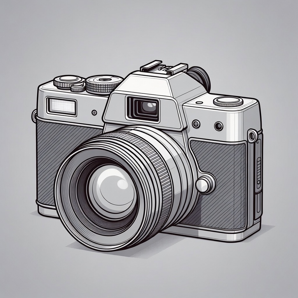 SLR camera, clipart, detailed sketch, dials, drawing, flash, grayscale, illustration, isolated background, lens, line art, photo camera, photography equipment, viewfinder, vintage camera, camera