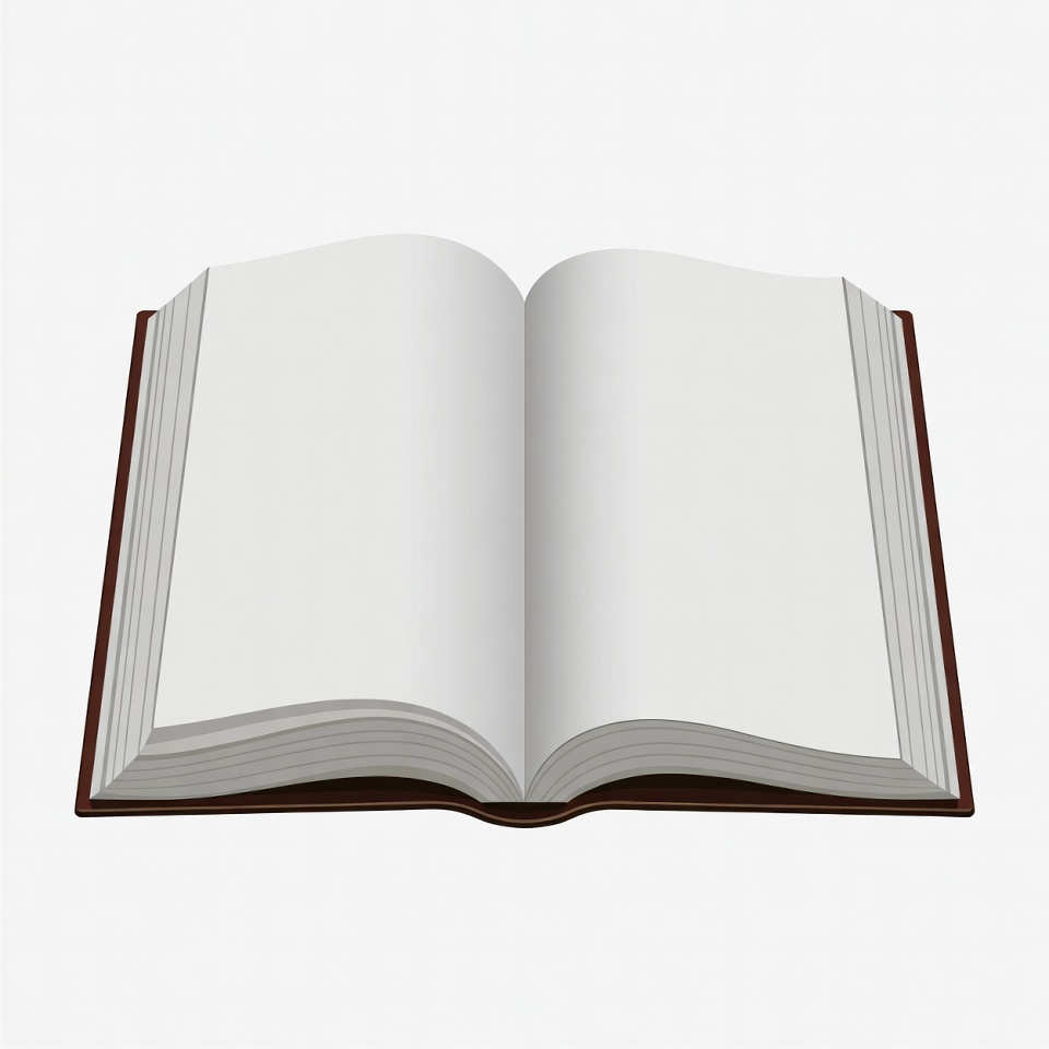 A simple illustration of an open book with blank white pages and brown leather cover. The book is viewed from above on a white background. The pages are spread wide, showing empty spreads.