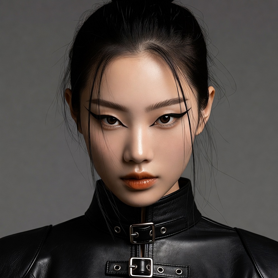 Asian, black hair, black leather, buckles, bun hairstyle, cat eyes, closeup, collar, eyeliner, fashion, female, high collar, leather outfit, orange lipstick, portrait, serious expression, shiny leather, silver buckles, woman, Asian woman