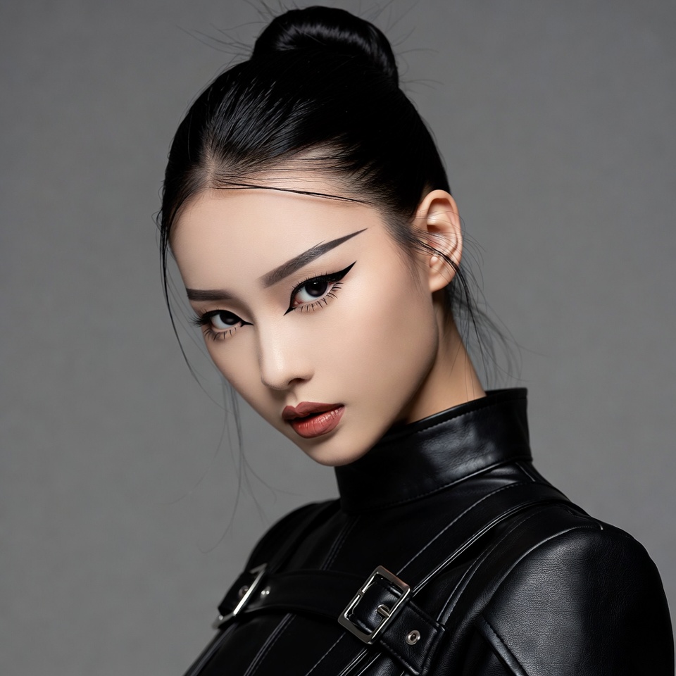 A young Asian woman with long black hair styled in a sleek bun poses confidently. She wears dramatic black eyeliner and matte lipstick, paired with a high-collared black leather outfit featuring silver buckles. Her expression is intense against a plain gray background.