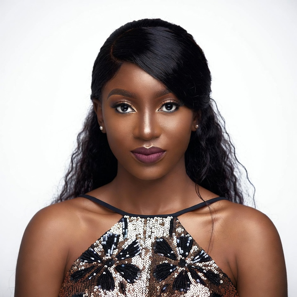 A young Black woman with long wavy black hair faces the camera against a white background. She wears a sparkling black sequin top with a halter neckline and bold dark lipstick. Her expressive eyes and glossy skin highlight her poised portrait.