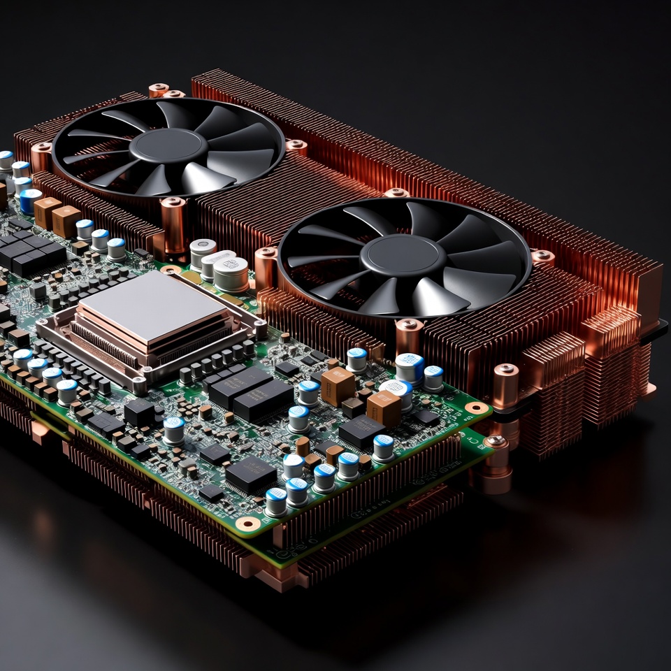 GPU, NVIDIA GPU, PC components, black fans, capacitors, chips, circuit board, computer hardware, cooling system, copper heatsink, dual GPU, electronics, gaming hardware, green PCB, high-end GPU, isolated background, tech hardware, video card, graphics card