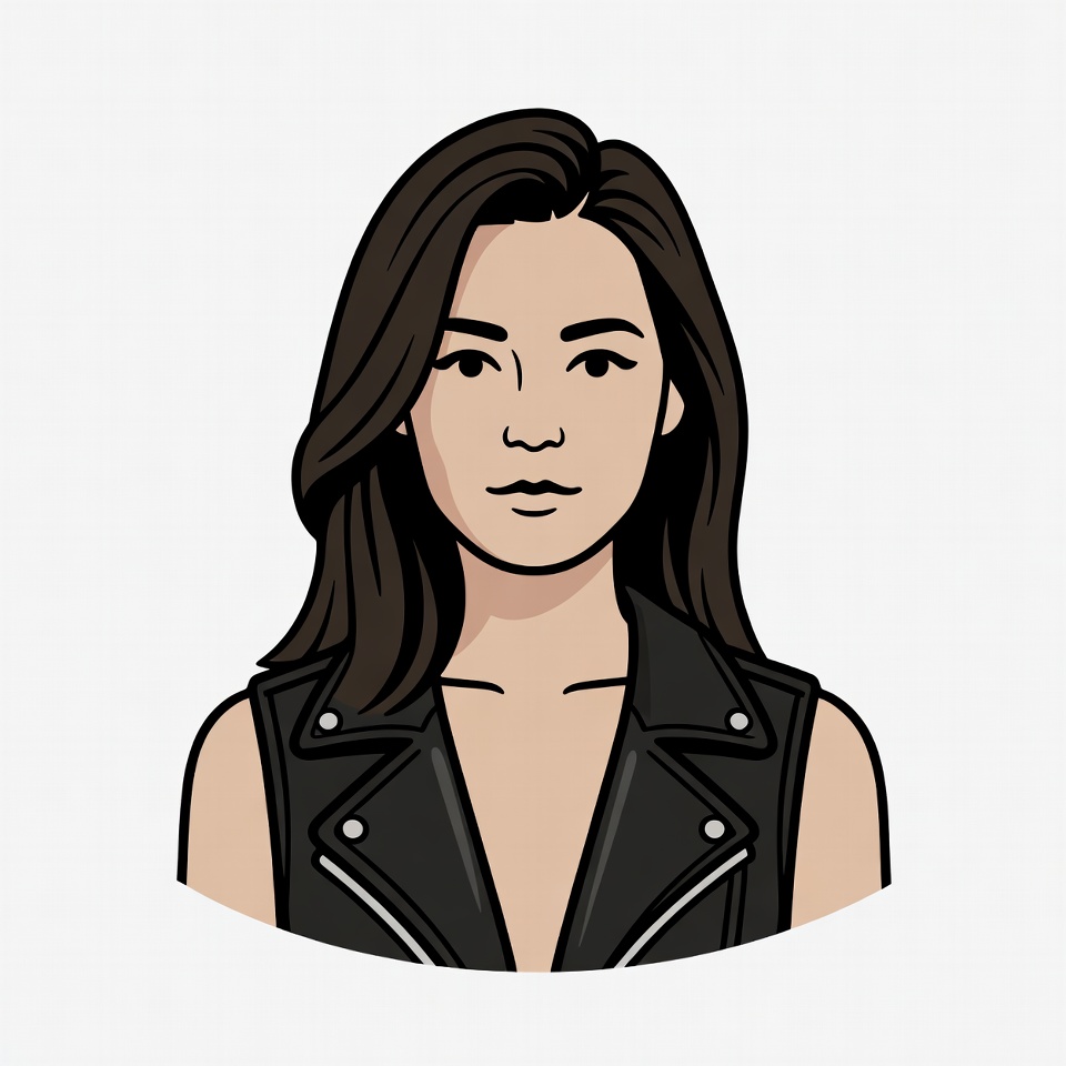 Asian, black hair, black vest, cartoon, clipart, dark hair, face, female, graphic, illustration, isolated background, leather vest, long hair, neutral expression, portrait, sleeveless vest, vector art, woman, zipper vest, Asian woman